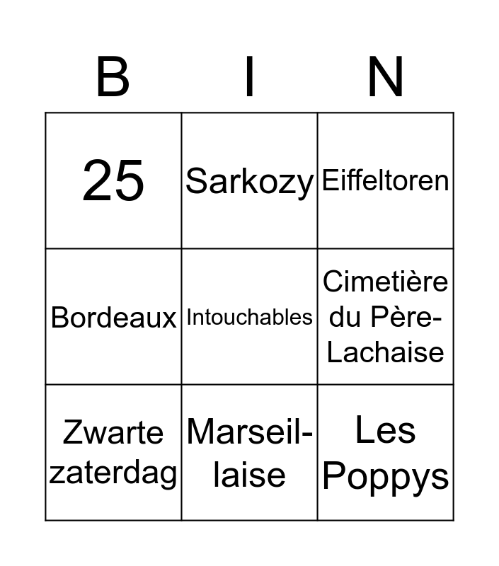 This bingo card has a free space and 10 words: Marseil- laise, Eiffeltoren, 25, Les Poppys, Bordeaux, Zwarte zaterdag, Sarkozy, Simone de Beauvoir, Cimetière du Père-Lachaise and Napoleon.
