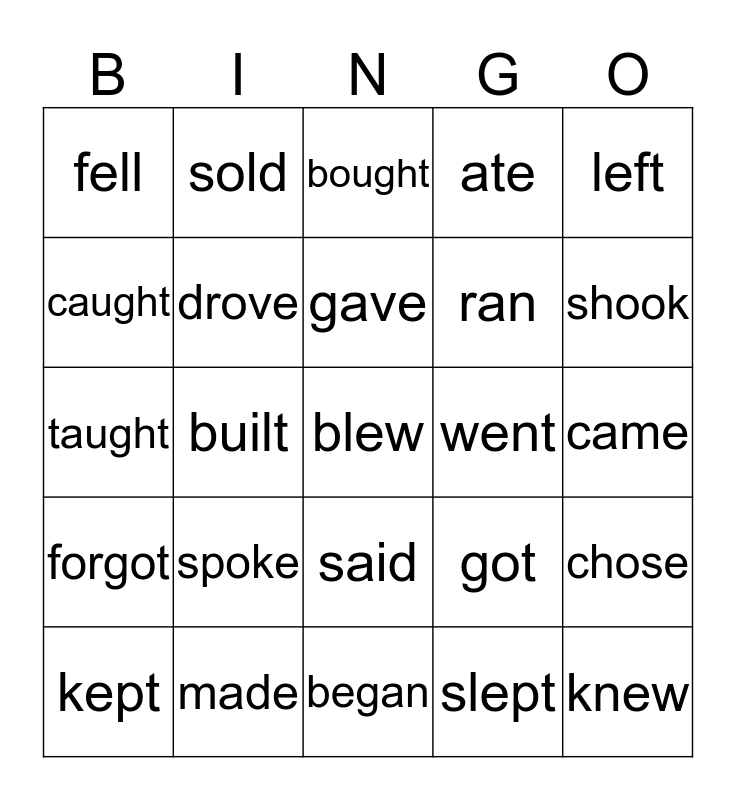 This bingo card has a free space and 24 words: kept, spoke, gave, slept, left, fell, sold, bought, went, came, taught, drove, got, chose, caught, made, began, ate, shook, forgot, built, said, ran and knew.