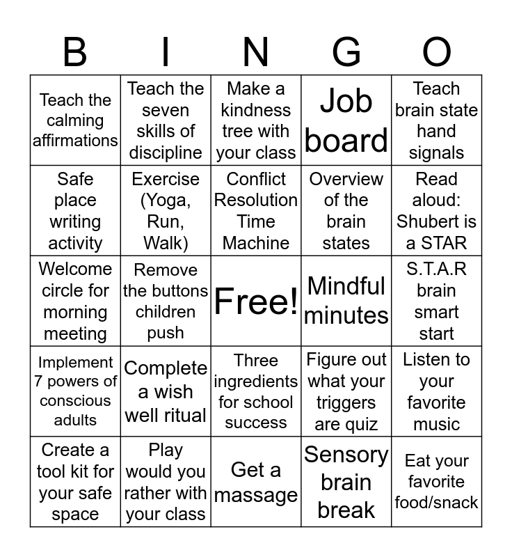 This bingo card has a free space and 24 words: Complete a wish well ritual, Play would you rather with your class, Conflict Resolution Time Machine, Create a tool kit for your safe space, Teach brain state hand signals, Teach the calming affirmations, Safe place writing activity, Teach the seven skills of discipline, Mindful minutes, Three ingredients for school success, Overview of the brain states, Welcome circle for morning meeting, Figure out what your triggers are quiz, Listen to your favorite music, Exercise (Yoga, Run, Walk), Sensory brain break, S.T.A.R brain smart start, Make a kindness tree with your class, Read aloud: Shubert is a STAR, Remove the buttons children push, Eat your favorite food/snack, Implement 7 powers of conscious adults, Job board and Get a massage.