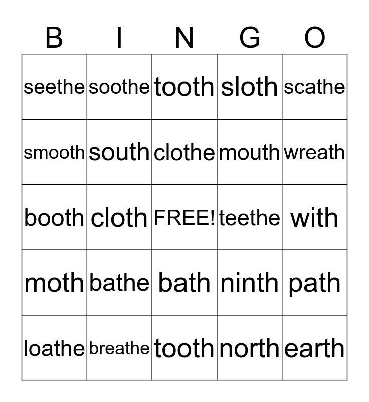 This bingo card has a free space and 24 words: bathe, breathe, clothe, loathe, scathe, seethe, smooth, soothe, teethe, bath, mouth, booth, ninth, path, south, north, with, tooth, wreath, cloth, earth, moth, sloth and tooth.