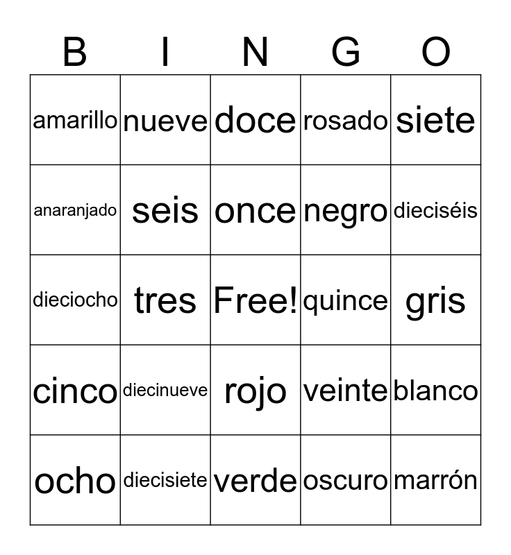 This bingo card has a free space and 33 words: uno, dos, tres, cuatro, cinco, seis, siete, ocho, nueve, diez, once, doce, trece, catorce, quince, dieciséis, diecisiete, dieciocho, diecinueve, veinte, rojo, morado, amarillo, gris, verde, marrón, rosado, negro, anaranjado, blanco, azul, oscuro and claro.