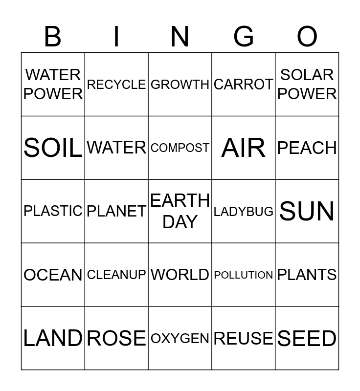 This bingo card has a free space and 34 words: FLOWER, DAISY, BEE, PROTECT, SUN, SOIL, WATER, OXYGEN, AIR, SEED, PLASTIC, RECYCLE, REUSE, REDUCE, OCEAN, PLANET, WORLD, LADYBUG, PLANTS, LAND, ROSE, COUGAR, CARROT, PEACH, FISH, CLEANUP, GROWTH, WIND POWER, SOLAR POWER, WATER POWER, BIRD, COMPOST, POLLUTION and LITTER.