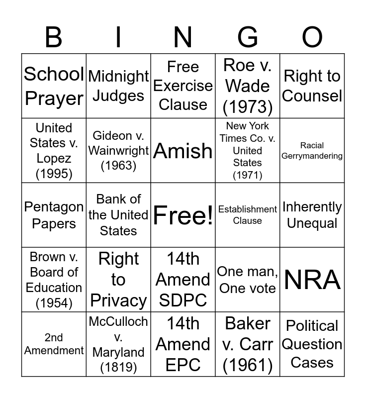This bingo card has a free space and 60 words: Marbury v. Madison (1803), McCulloch v. Maryland (1819), Schenck v. United States (1919), Brown v. Board of Education (1954), Baker v. Carr (1961), Engel v. Vitale (1962), Gideon v. Wainwright (1963), Tinker v. Des Moines (1969), New York Times Co. v. United States (1971), Wisconsin v. Yoder (1972), Roe v. Wade (1973), Shaw v. Reno (1993), United States v. Lopez (1995), Citizens United v. Federal Election Commission (2010), McDonald v. Chicago (2010), School Prayer, Political Question Cases, Right to Counsel, Public Defender, Amish, Establishment Clause, Free Exercise Clause, 2nd Amendment, NRA, Corporate Speech, Destroying our Democracy, Supremacy Clause, Necessary and Proper (Elastic) Clause, Racial Gerrymandering, Mal-apportionment, Judicial Review, Student Rights, Black Arm Bands, Vietnam War, Midnight Judges, WWI, Clear and Present Danger Test, Bank of the United States, Amish, Pentagon Papers, Abortion, Right to Privacy, Inherently Unequal, NAACP, One man, One vote, No Prior Restraint, Judiciary Act of 1789, Gun-Free School Zones Act, Incorporation, 14th Amend SDPC, 14th Amend EPC, Freedom of the Press, Freedom of Speech, Symbolic Speech, Stare Decisis, Interstate Commerce Clause, Federalism, Little Rock Nine, Plessy v. Ferguson and Separate but equal.