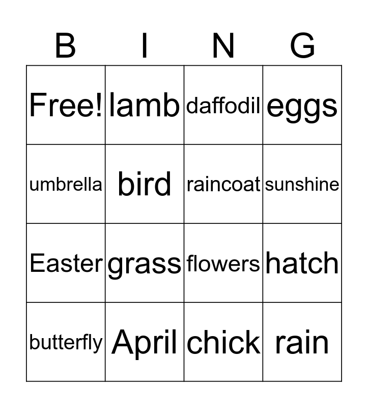 This bingo card has 16 words: April, hatch, daffodil, Free!, Easter, lamb, flowers, chick, umbrella, bird, butterfly, eggs, grass, sunshine, raincoat and rain.