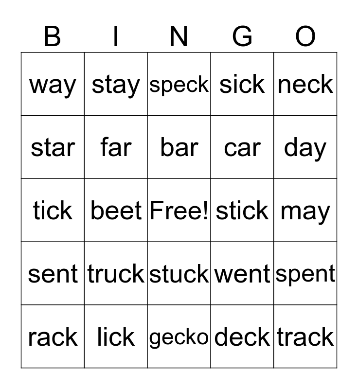 This bingo card has a free space and 44 words: black, track, back, rack, tack, deck, speck, peck, neck, lick, sick, stick, stuck, truck, duck, gecko, luck, tick, backpack, day, stay, say, spray, way, tray, may, ray, lay, went, sent, tent, spent, feet, teeth, beet, see, tree, guitar, bar, star, car, are, far and art.
