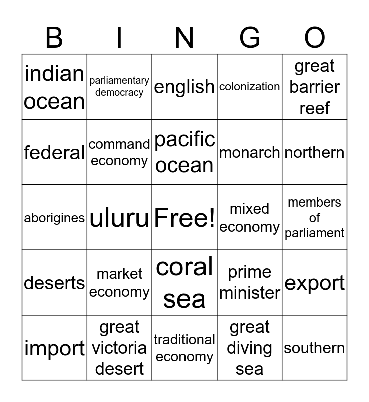 This bingo card has a free space and 26 words: coral sea, great diving sea, pacific ocean, great victoria desert, great barrier reef, indian ocean, federal, parliamentary democracy, members of parliament, prime minister, monarch, aborigines, export, import, uluru, penal colony, colonization, deserts, english, southern, northern, traditional economy, mixed economy, market economy, command economy and specialization.