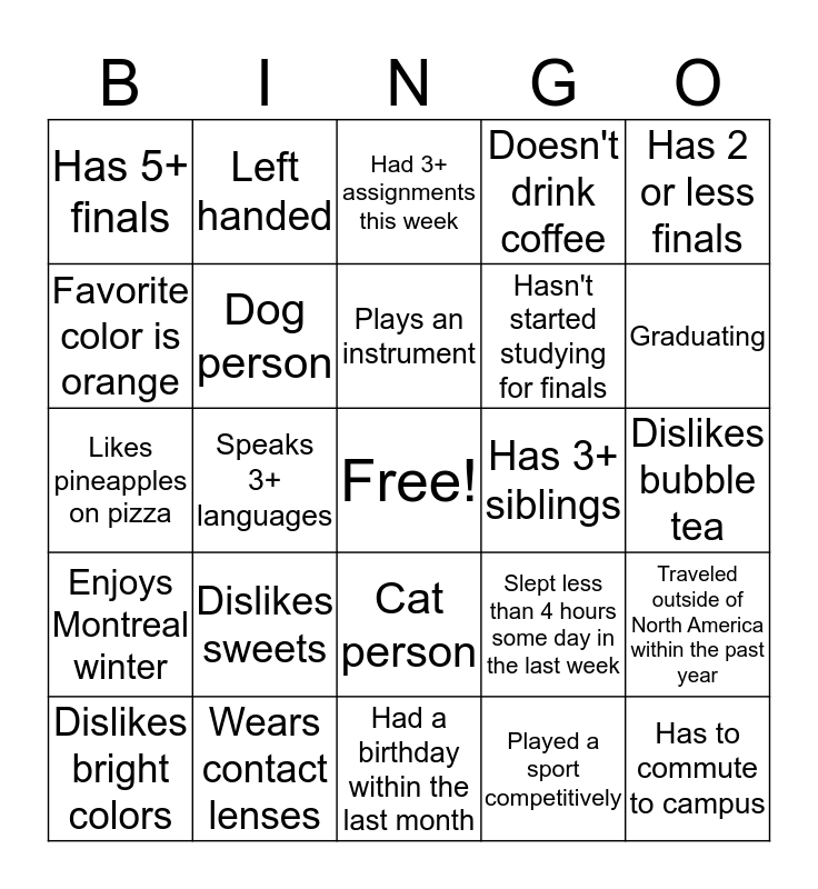 This bingo card has a free space and 24 words: Dislikes sweets, Wears contact lenses, Plays an instrument, Dislikes bright colors, Has 2 or less finals, Has 5+ finals, Favorite color is orange, Left handed, Has 3+ siblings, Cat person, Hasn't started studying for finals, Likes pineapples on pizza, Slept less than 4 hours some day in the last week, Traveled outside of North America within the past year, Dog person, Played a sport competitively, Dislikes bubble tea, Had 3+ assignments this week, Graduating, Speaks 3+ languages, Has to commute to campus, Enjoys Montreal winter, Doesn't drink coffee and Had a birthday within the last month.