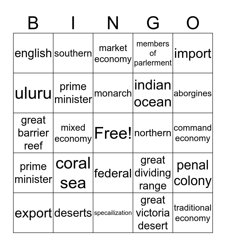 This bingo card has a free space and 24 words: coral sea, deserts, monarch, export, import, english, uluru, southern, northern, federal, indian ocean, great barrier reef, great dividing range, penal colony, prime minister, great victoria desert, command economy, market economy, aborgines, mixed economy, traditional economy, prime minister, members of parlerment and specailization.
