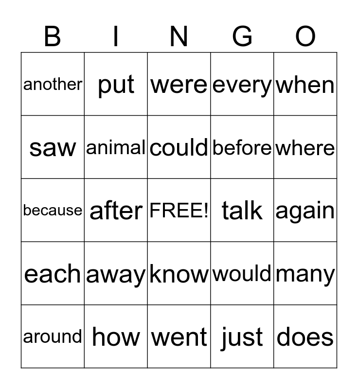 This bingo card has a free space and 24 words: away, how, could, around, when, another, saw, put, talk, know, before, because, would, many, animal, just, again, were, where, after, does, each, every and went.