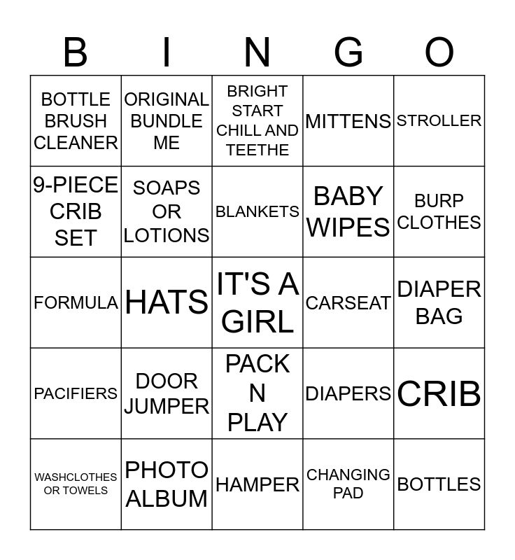 This bingo card has a free space and 24 words: DOOR JUMPER, PHOTO ALBUM, BLANKETS, WASHCLOTHES OR TOWELS, STROLLER, BOTTLE BRUSH CLEANER, 9-PIECE CRIB SET, ORIGINAL BUNDLE ME, CARSEAT, PACK N PLAY, BABY WIPES, FORMULA, DIAPERS, CRIB, SOAPS OR LOTIONS, CHANGING PAD, DIAPER BAG, BRIGHT START CHILL AND TEETHE, BURP CLOTHES, HATS, BOTTLES, PACIFIERS, MITTENS and HAMPER.