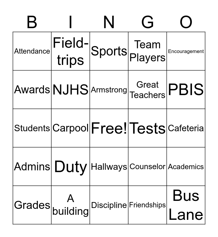 This bingo card has a free space and 24 words: Duty, A building, Armstrong, Grades, Encouragement, Attendance, Awards, Field-trips, Tests, Hallways, Great Teachers, Students, Counselor, Academics, NJHS, Friendships, Cafeteria, Sports, PBIS, Carpool, Bus Lane, Admins, Team Players and Discipline.