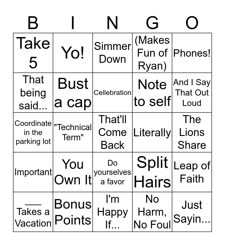 This bingo card has 30 words: Bonus Points, Hymnals, "Technical Term", Hint, Take 5, Simmer Down, Bust a cap, Do yourselves a favor, Literally, I'm Happy If..., The Lions Share, That'll Come Back, No Harm, No Foul, Just Sayin..., And I Say That Out Loud, (Happy Face/Cell), Split Hairs, Important, You Own It, Phones!, Coordinate in the parking lot, So we are all on the same page, Yo!, Note to self, That being said..., (Makes Fun of Ryan), Leap of Faith, ___ Takes a Vacation, Cellebration and More to come.
