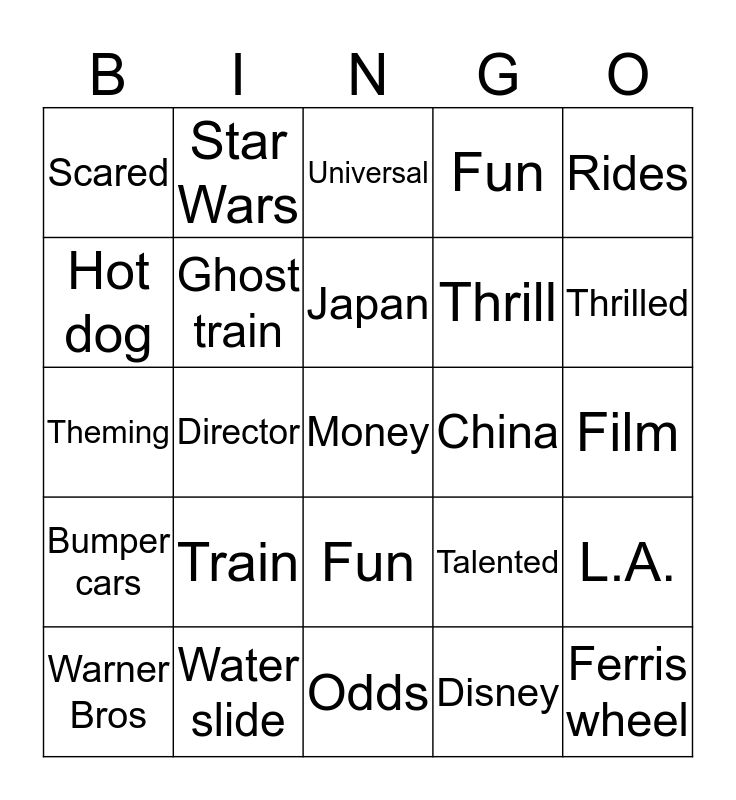 This bingo card has 62 words: Log Flume, Water slide, Roller coaster, Bumper cars, Ferris wheel, Carousel, Ghost train, Waltzer, Thrill, Excited, Fun, Arcade, Hot dog, Pirate ship, Balloons, Scared, Money, Rides, Pop, Japan, China, Universal, Warner Bros, Disney, Harry Potter, Ride, Roller Coaster, Orlando, L.A., Anaheim, Scene 1, Show, Spectacular, Character, Film, Star Wars, Guest, Creative, Director, Production, Theming, Water, Train, Thanks, Thrilled, Talented, Experience, Entrance, Ticket, Money, Fun, Odds, Time, Very, Fantastic, Pirate, Future, Projections, Audio, World, Number 1 and Best.