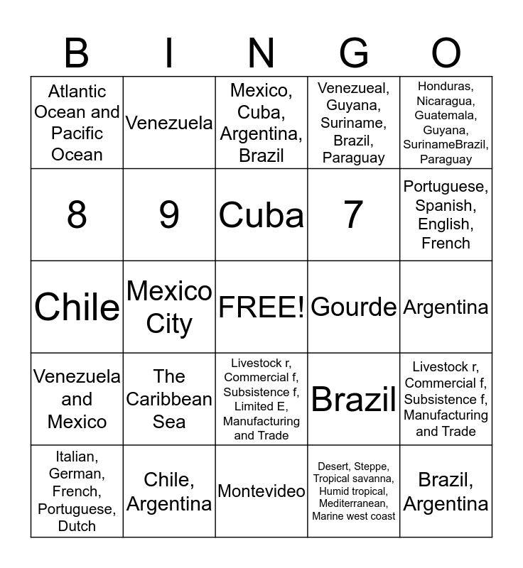 This bingo card has a free space and 24 words: The Caribbean Sea, Chile, Argentina, Cuba, Italian, German, French, Portuguese, Dutch, Honduras, Nicaragua, Guatemala, Guyana, SurinameBrazil, Paraguay, Atlantic Ocean and Pacific Ocean, 8, Venezuela, Gourde, Livestock r, Commercial f, Subsistence f, Limited E, Manufacturing and Trade, 7, Chile, Brazil, Livestock r, Commercial f, Subsistence f, Manufacturing and Trade, 9, Desert, Steppe, Tropical savanna, Humid tropical, Mediterranean, Marine west coast, Argentina, Mexico, Cuba, Argentina, Brazil, Portuguese, Spanish, English, French, Mexico City, Brazil, Argentina, Venezuela and Mexico, Venezueal, Guyana, Suriname, Brazil, Paraguay and Montevideo.