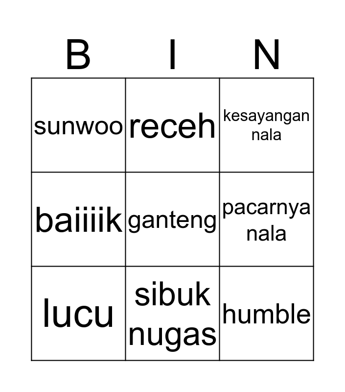 This bingo card has a free space and 8 words: pacarnya nala, kesayangan nala, receh, lucu, sunwoo, humble, baiiiik and sibuk nugas.