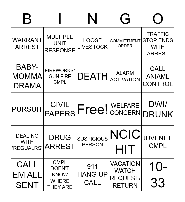 This bingo card has a free space and 24 words: DRUG ARREST, CMPL DOEN'T KNOW WHERE THEY ARE, DEATH, CALL EM ALL SENT, TRAFFIC STOP ENDS WITH ARREST, WARRANT ARREST, BABY-MOMMA DRAMA, MULTIPLE UNIT RESPONSE, WELFARE CONCERN, SUSPICIOUS PERSON, ALARM ACTIVATION, PURSUIT, NCIC HIT, JUVENILE CMPL, FIREWORKS/ GUN FIRE CMPL, VACATION WATCH REQUEST/ RETURN, DWI/ DRUNK, LOOSE LIVESTOCK, CALL ANIAML CONTROL, CIVIL PAPERS, 10-33, DEALING WITH 'REGUALRS', COMMITTMENT ORDER and 911 HANG UP CALL.