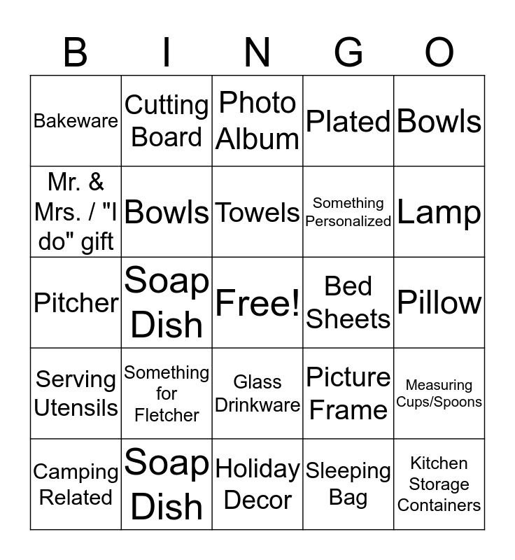 This bingo card has a free space and 39 words: Game, Gift Card, Grilling Related, Bowls, Camping Related, Glass Drinkware, Towels, Serving Dish, Bowls, Serving Utensils, Soap Dish, Plated, Kitchen Storage Containers, Pillow, Bed Sheets, Something for Fletcher, Frying Pan, Bakeware, Casserole Dish, Picture Frame, Mr. & Mrs. / "I do" gift, Holiday Decor, Something Personalized, Lamp, Pots, Large item that can't fit on a plane, Laundry Related, Small Kitchen Appliance, Check, Cutting Board, Handyman Tools, Blanket, Photo Album, Soap Dish, Sleeping Bag, Something Monogrammed, Measuring Cups/Spoons, Pitcher and Non-Food Storage / Organizer.