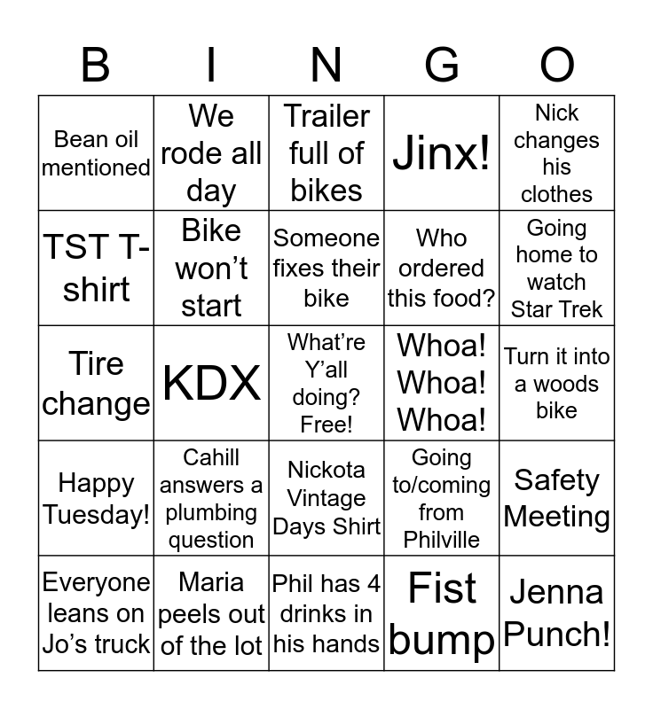 This bingo card has a free space and 24 words: Cahill answers a plumbing question, Maria peels out of the lot, Someone fixes their bike, Everyone leans on Jo’s truck, Nick changes his clothes, Bean oil mentioned, TST T-shirt, We rode all day, Whoa! Whoa! Whoa!, Nickota Vintage Days Shirt, Who ordered this food?, Tire change, Going to/coming from Philville, Safety Meeting, Bike won’t start, Fist bump, Turn it into a woods bike, Trailer full of bikes, Going home to watch Star Trek, KDX, Jenna Punch!, Happy Tuesday!, Jinx! and Phil has 4 drinks in his hands.