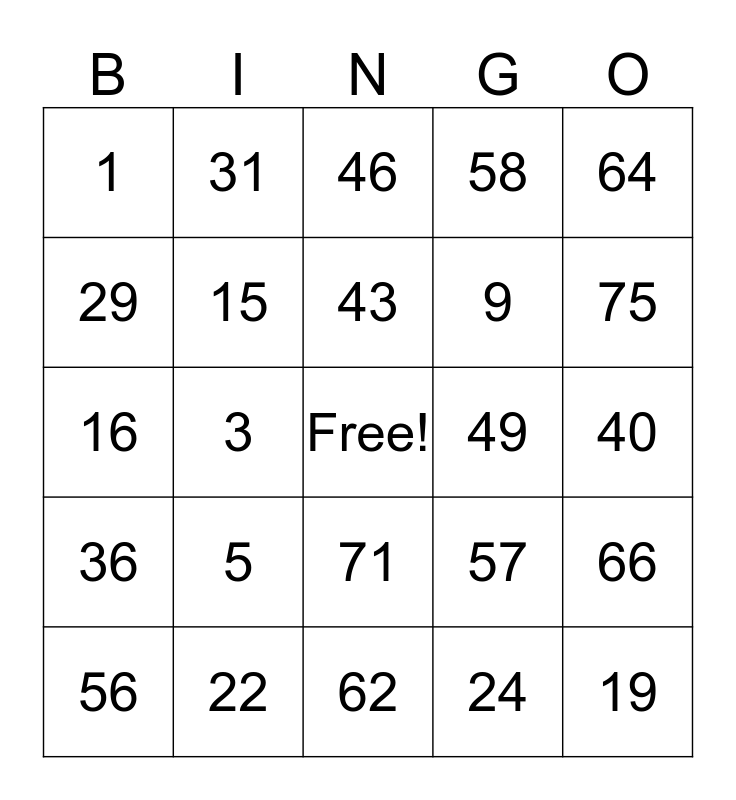 This bingo card has a free space and 24 words: 5, 22, 43, 56, 64, 1, 29, 31, 49, 71, 9, 16, 57, 66, 15, 24, 40, 46, 75, 3, 19, 36, 58 and 62.