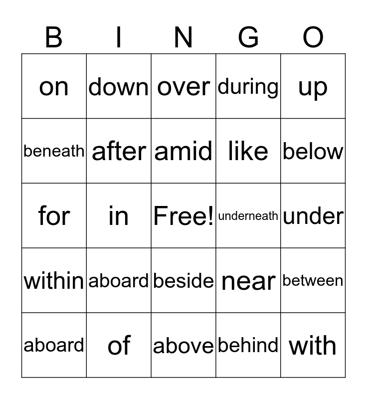 This bingo card has a free space and 29 words: aboard, by, in, from, on, over, after, aboard, underneath, of, under, with, above, behind, below, since, beside, within, up, for, near, except, like, beneath, during, down, between, amid and among.