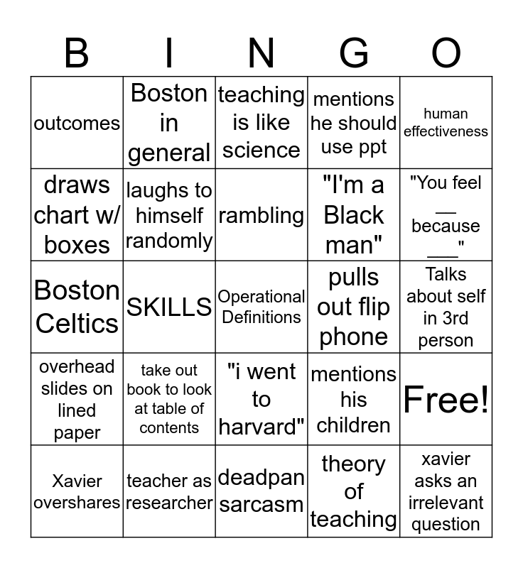 This bingo card has 26 words: "i went to harvard", theory of teaching, rambling, teacher as researcher, human effectiveness, outcomes, draws chart w/ boxes, Boston in general, Talks about self in 3rd person, mentions his children, "I'm a Black man", Boston Celtics, Free!, Xavier overshares, SKILLS, mentions his wife, mentions he should use ppt, overhead slides on lined paper, teaching is like science, Operational Definitions, "You feel __ because ___", deadpan sarcasm, pulls out flip phone, take out book to look at table of contents, laughs to himself randomly and xavier asks an irrelevant question.