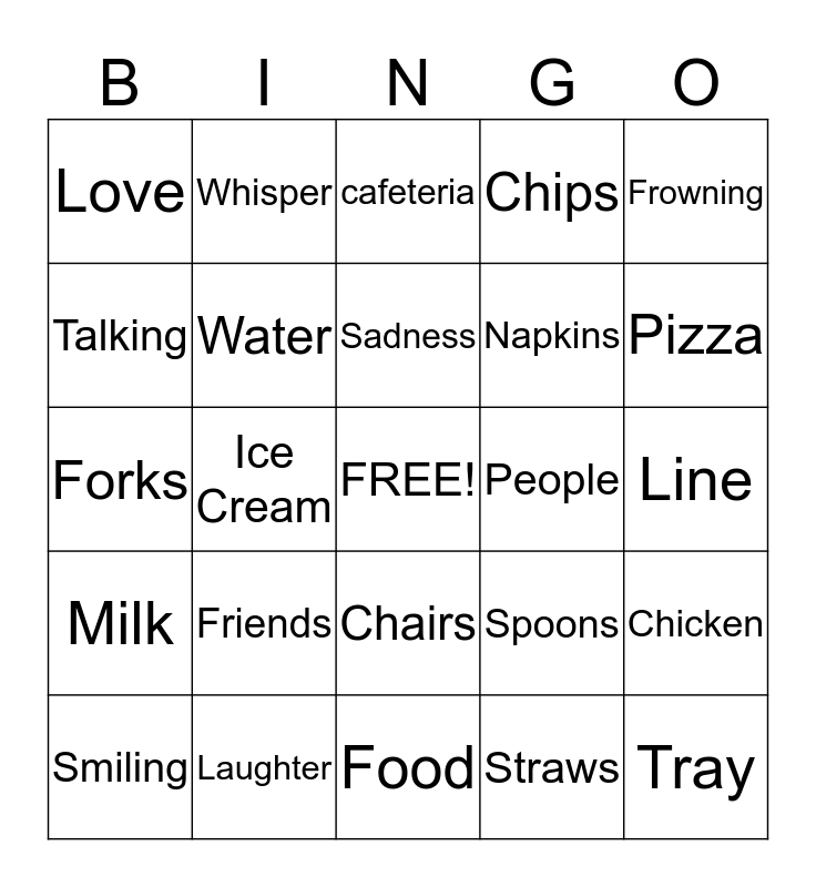 This bingo card has a free space and 24 words: Friends, Laughter, Sadness, Smiling, Frowning, Love, Talking, Whisper, People, Chairs, Napkins, Forks, Spoons, Chicken, Water, Straws, Line, cafeteria, Pizza, Ice Cream, Tray, Milk, Chips and Food.