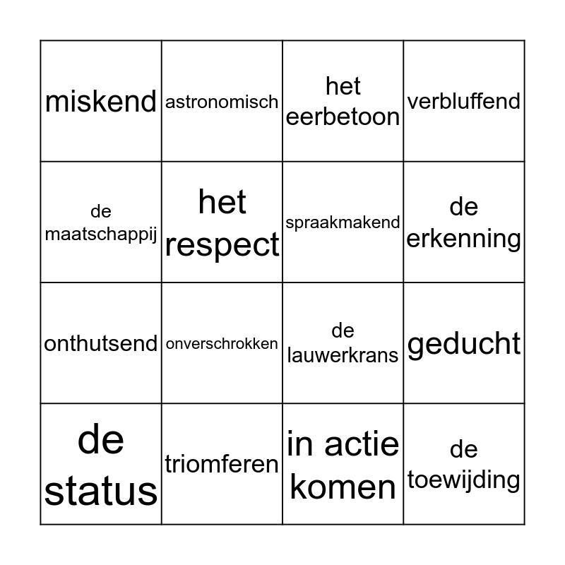 This bingo card has 19 words: de lauwerkrans, de bravoure, het eerbetoon, de toewijding, geducht, de maatschappij, in actie komen, miskend, astronomisch, onthutsend, onverschrokken, het respect, spraakmakend, triomferen, de status, waarderen, verbluffend, de erkenning and de ode.