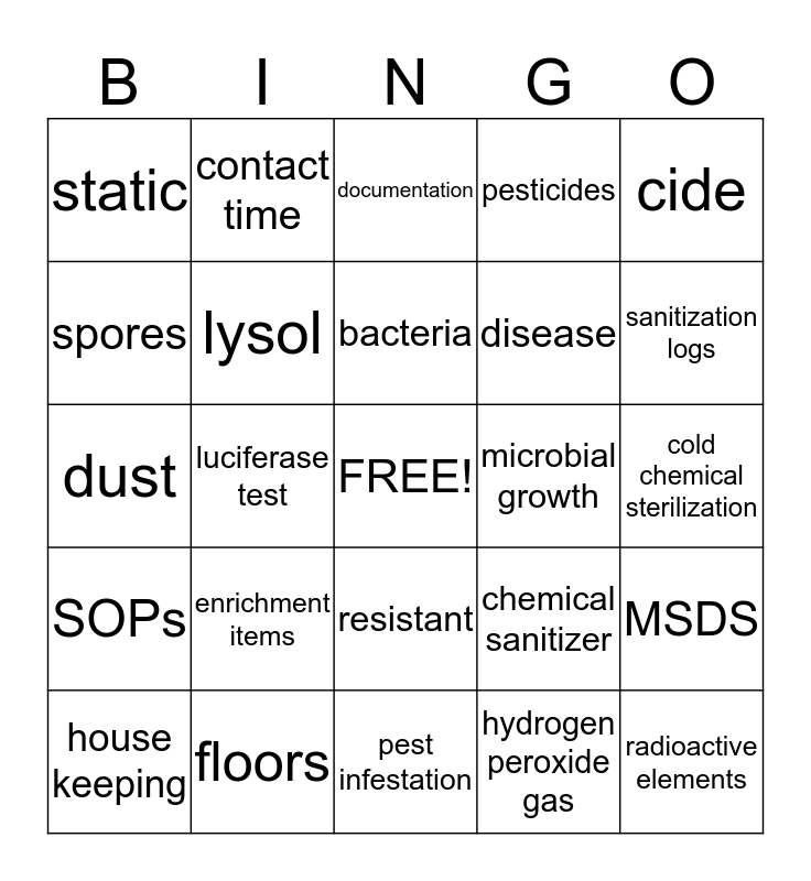 This bingo card has a free space and 24 words: enrichment items, floors, bacteria, house keeping, cide, static, spores, contact time, microbial growth, resistant, disease, dust, chemical sanitizer, MSDS, lysol, hydrogen peroxide gas, cold chemical sterilization, documentation, sanitization logs, luciferase test, radioactive elements, SOPs, pesticides and pest infestation.