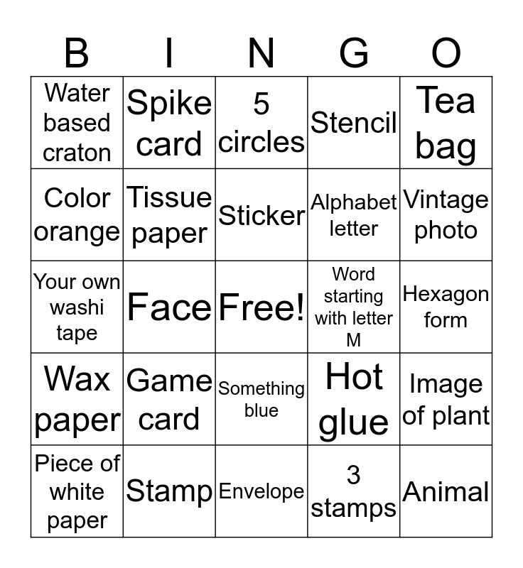 This bingo card has a free space and 24 words: Game card, Stamp, Sticker, Piece of white paper, Tea bag, Water based craton, Color orange, Spike card, Word starting with letter M, Something blue, Alphabet letter, Your own washi tape, Hot glue, Image of plant, Tissue paper, 3 stamps, Hexagon form, 5 circles, Vintage photo, Face, Animal, Wax paper, Stencil and Envelope.