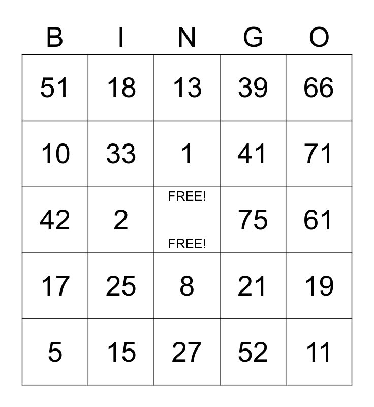 This bingo card has a free space and 24 words: 25, 15, 1, 5, 66, 51, 10, 18, 75, 8, 41, 42, 21, 19, 33, 52, 61, 13, 71, 2, 11, 17, 39 and 27.