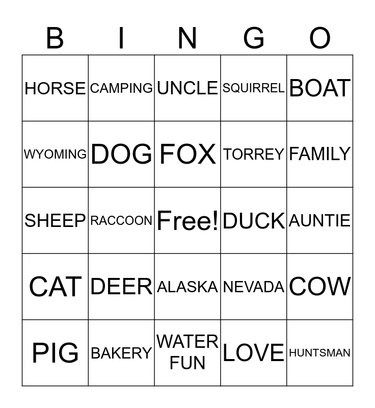 This bingo card has a free space and 25 words: DEER, WATER FUN, FOX, PIG, BOAT, HORSE, WYOMING, CAMPING, DUCK, ALASKA, TORREY, SHEEP, NEVADA, COW, DOG, SKUNK, AUNTIE, UNCLE, FAMILY, RACCOON, HUNTSMAN, BAKERY, CAT, SQUIRREL and LOVE.