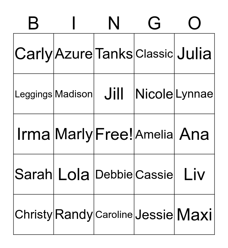 This bingo card has a free space and 27 words: Cassie, Perfect, Nicole, Caroline, Leggings, Tanks, Azure, Sarah, Amelia, Liv, Irma, Classic, Christy, Randy, Lynnae, Shirley, Madison, Jill, Lola, Carly, Ana, Jessie, Marly, Maxi, Debbie, Julia and Maria.