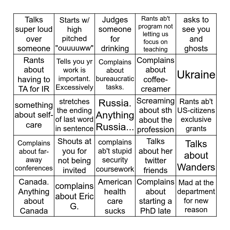 This bingo card has a free space and 24 words: Shouts at you for not being invited, complains about Eric G., Complains about bureaucratic tasks., Canada. Anything about Canada, asks to see you and ghosts, Talks super loud over someone, Rants about having to TA for IR, Starts w/ high pitched "ouuuuww", Screaming about sth about the profession, complains ab't stupid security coursework, Complains about coffee-creamer, something about self-care, Talks about her twitter friends, Talks about Wanders, Tells you yr work is important. Excessively, Complains about starting a PhD late, Rants ab't US-citizens exclusive grants, Judges someone for drinking, Ukraine, stretches the ending of last word in sentence, Mad at the department for new reason, Complains about far-away conferences, Rants ab't program not letting us focus on teaching and American health care sucks.
