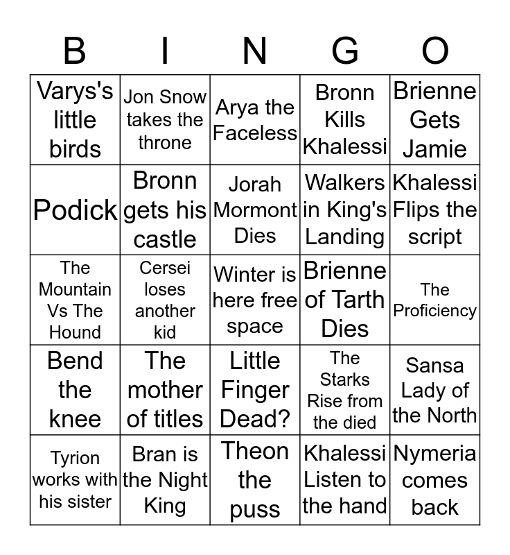 This bingo card has a free space and 24 words: The mother of titles, Bran is the Night King, Jorah Mormont Dies, Tyrion works with his sister, Brienne Gets Jamie, Varys's little birds, Podick, Jon Snow takes the throne, Brienne of Tarth Dies, Little Finger Dead?, Walkers in King's Landing, The Mountain Vs The Hound, The Starks Rise from the died, Sansa Lady of the North, Bronn gets his castle, Khalessi Listen to the hand, The Proficiency, Arya the Faceless, Khalessi Flips the script, Cersei loses another kid, Nymeria comes back, Bend the knee, Bronn Kills Khalessi and Theon the puss.