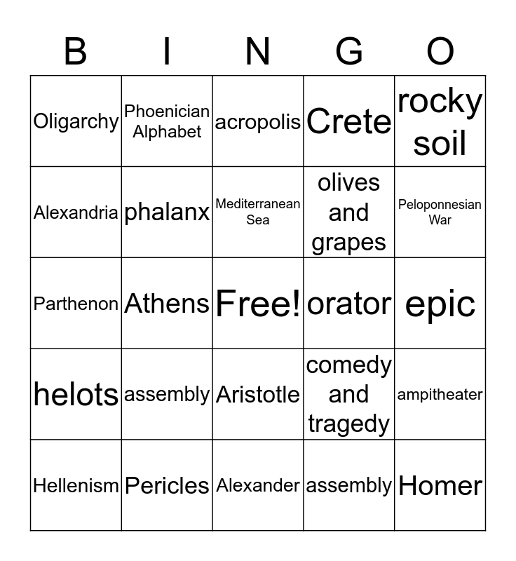 This bingo card has a free space and 29 words: Hellenism, agora, Athens, Sparta, Oligarchy, acropolis, phalanx, assembly, orator, Pericles, epic, Homer, Alexander, assembly, Peloponnesian War, Plato, Aristotle, helots, rocky soil, Parthenon, comedy and tragedy, Olympia, olives and grapes, Alexandria, Crete, Phoenician Alphabet, ampitheater, Mediterranean Sea and Aegean Sea.