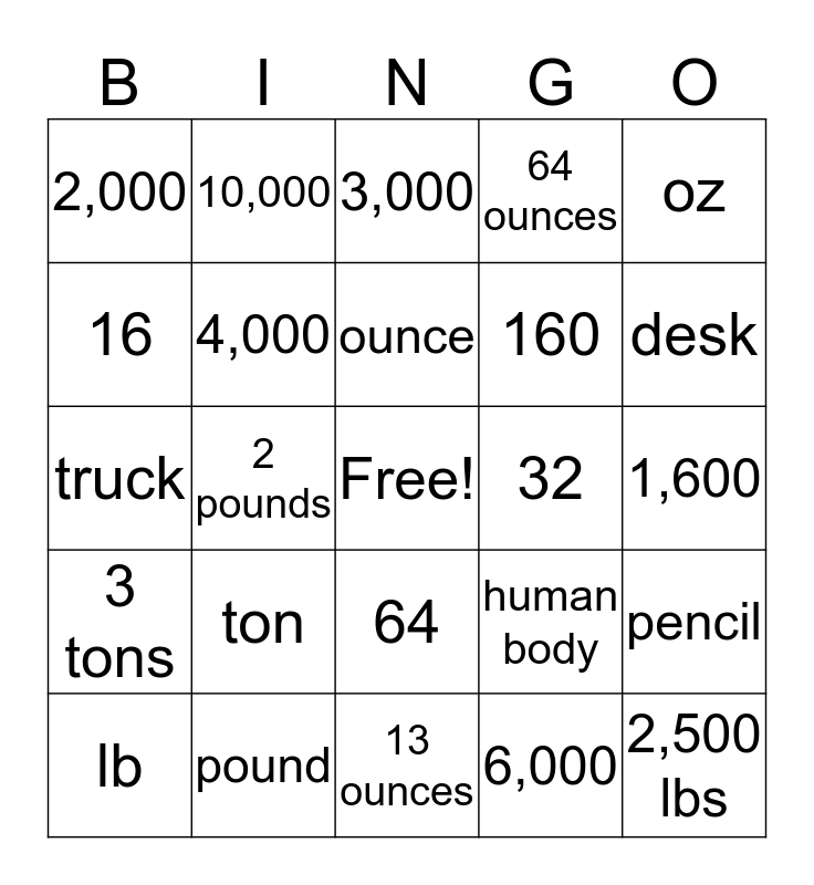 This bingo card has a free space and 24 words: ton, pound, ounce, lb, oz, 2,000, 16, 10,000, 32, 64, 160, truck, human body, pencil, 4,000, 6,000, 1,600, 3,000, desk, 2 pounds, 2,500 lbs, 3 tons, 64 ounces and 13 ounces.