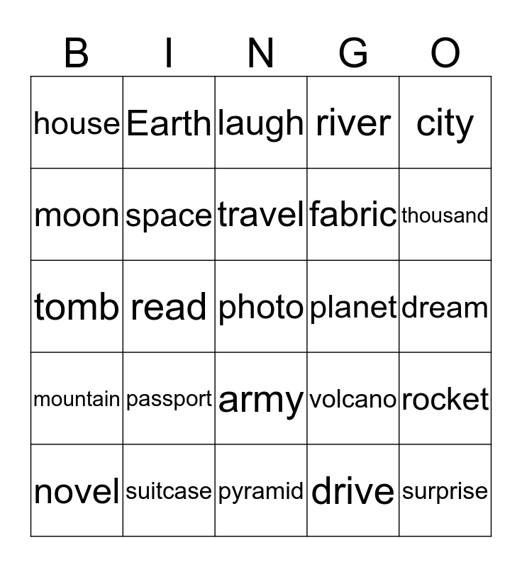 This bingo card has a free space and 24 words: passport, suitcase, travel, novel, city, house, moon, Earth, planet, army, fabric, tomb, volcano, rocket, space, drive, dream, laugh, thousand, read, surprise, mountain, river and pyramid.