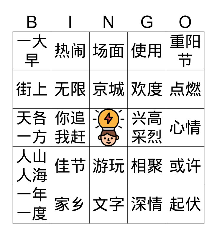 This bingo card has a free space and 24 words: 佳节, 家乡, 京城, 一年一度, 重阳节, 一大早, 街上, 热闹, 兴高采烈, 游玩, 欢度, 天各一方, 相聚, 或许, 无限, 深情, 心情, 场面, 点燃, 你追我赶, 起伏, 人山人海, 使用 and 文字.