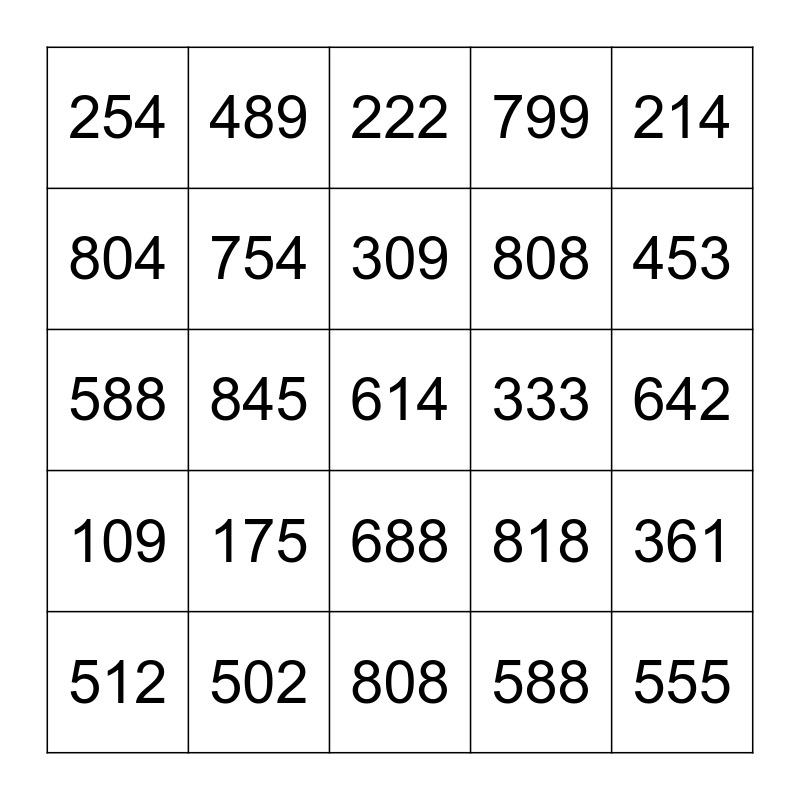 This bingo card has 50 words: 682, 614, 251, 808, 175, 932, 489, 279, 804, 385, 754, 799, 361, 818, 102, 426, 309, 333, 989, 214, 845, 588, 254, 808, 683, 555, 453, 253, 222, 688, 573, 952, 808, 766, 502, 336, 860, 649, 333, 642, 882, 911, 829, 595, 512, 588, 442, 369, 109 and 879.
