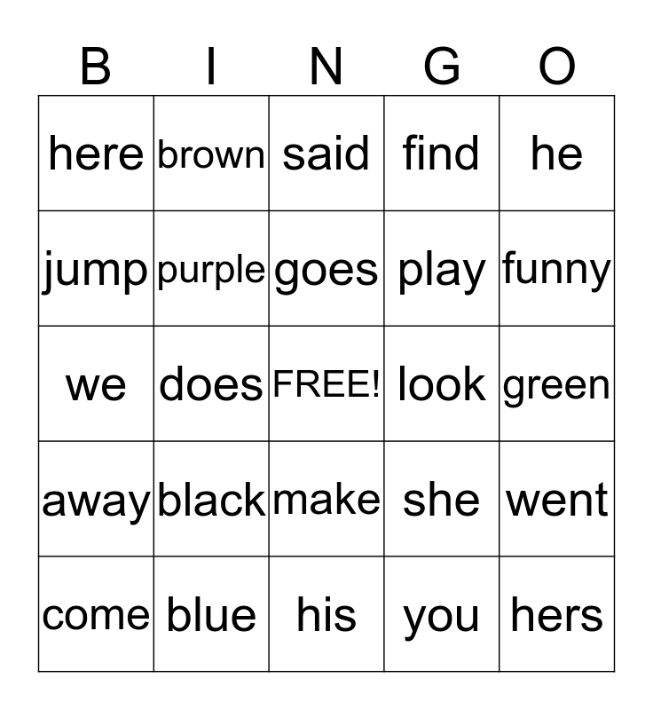 This bingo card has a free space and 24 words: black, blue, goes, come, he, here, jump, brown, look, make, play, we, she, went, purple, you, green, said, funny, does, hers, away, find and his.
