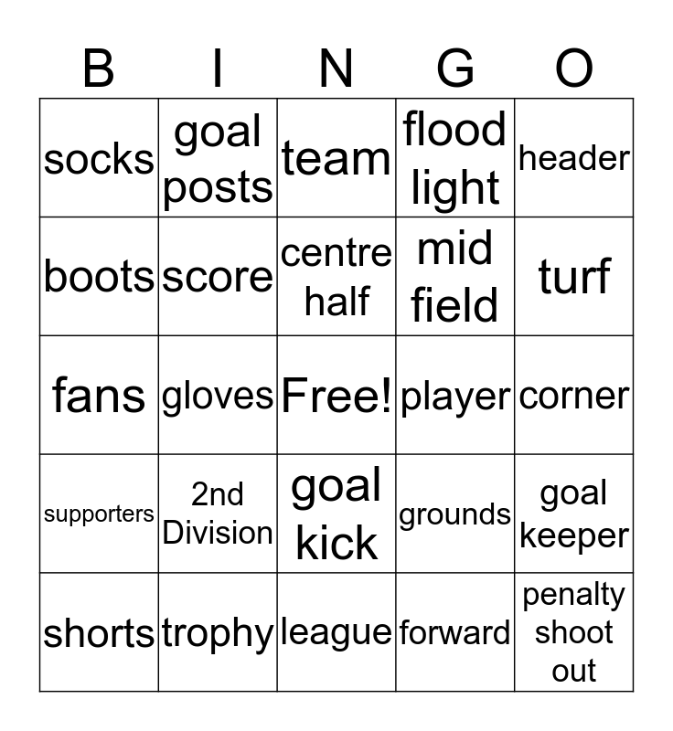 This bingo card has a free space and 24 words: 2nd Division, trophy, centre half, shorts, header, socks, boots, goal posts, player, goal kick, mid field, fans, grounds, goal keeper, score, forward, corner, team, turf, gloves, penalty shoot out, supporters, flood light and league.