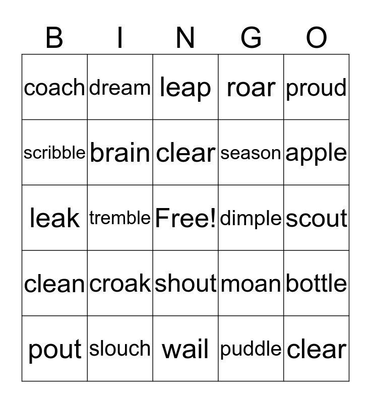 This bingo card has a free space and 29 words: pout, year, tremble, bail, coach, leap, brain, croak, dimple, slouch, scout, clear, wail, puddle, apple, maid, shout, clean, proud, leak, moan, jail, season, scribble, roar, dream, bottle, clear and grain.
