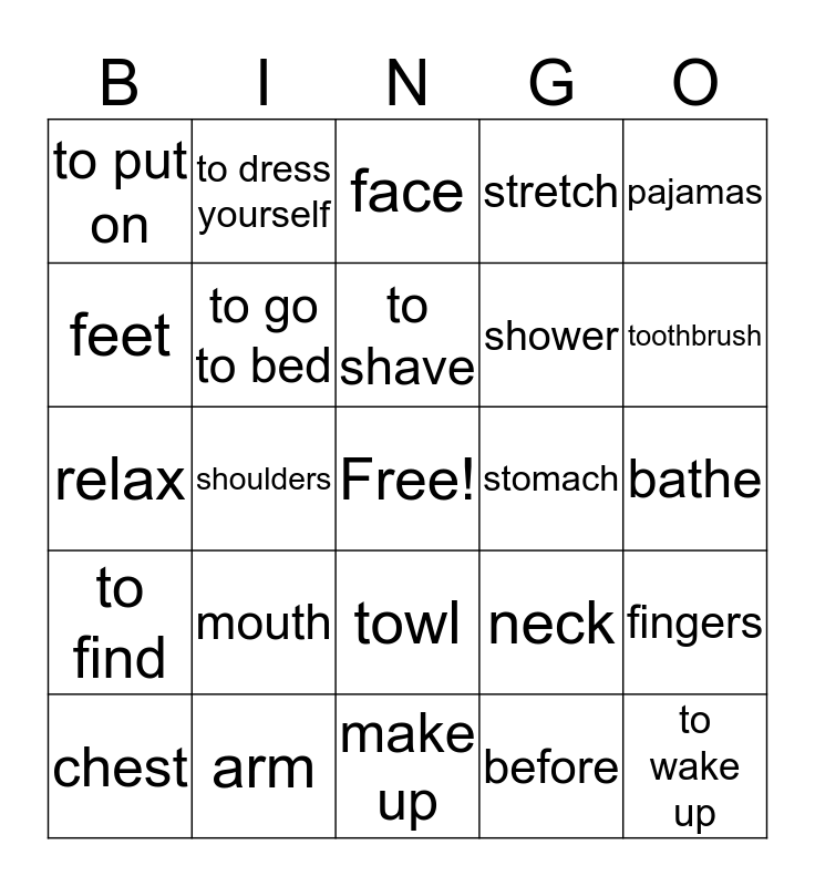 This bingo card has a free space and 24 words: mouth, arm, to shave, chest, pajamas, to put on, feet, to dress yourself, stomach, towl, shower, relax, neck, fingers, to go to bed, before, bathe, face, toothbrush, shoulders, to wake up, to find, stretch and make up.