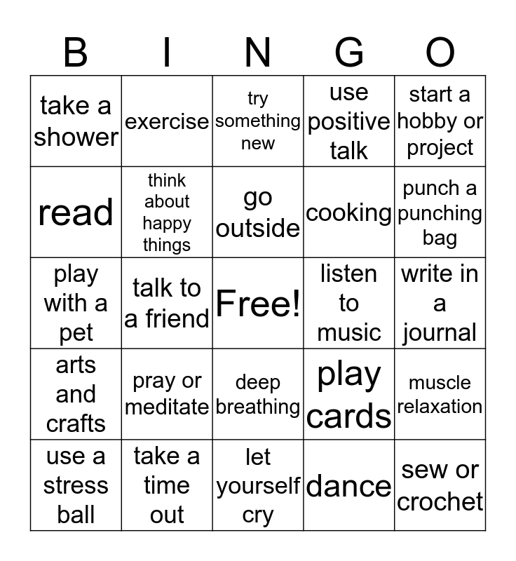 This bingo card has a free space and 24 words: pray or meditate, take a time out, go outside, use a stress ball, start a hobby or project, take a shower, read, exercise, listen to music, deep breathing, cooking, play with a pet, play cards, muscle relaxation, think about happy things, dance, write in a journal, try something new, punch a punching bag, talk to a friend, sew or crochet, arts and crafts, use positive talk and let yourself cry.
