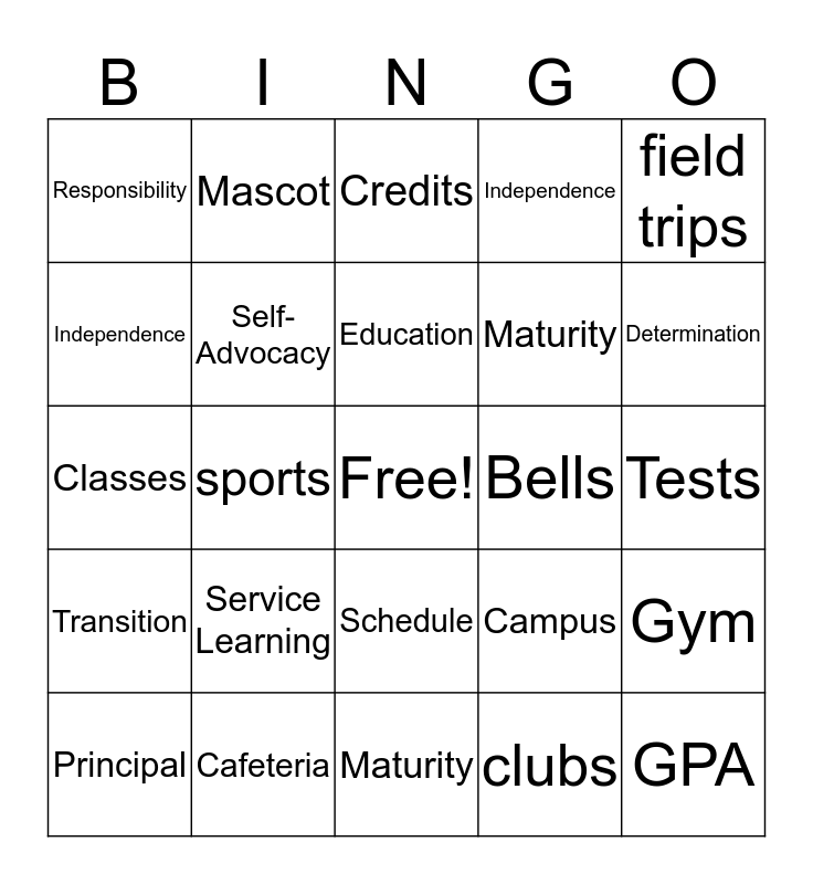 This bingo card has a free space and 32 words: clubs, Driving, sports, Projects, Transition, Self-Advocacy, field trips, Gym, Mascot, Goals, Education, Credits, Completer Programs, College, Bells, Diploma, Principal, Classes, Schedule, Service Learning, Campus, Job, Tests, Cafeteria, GPA, Independence, Maturity, Independence, Responsibility, Maturity, Opportunity and Determination.