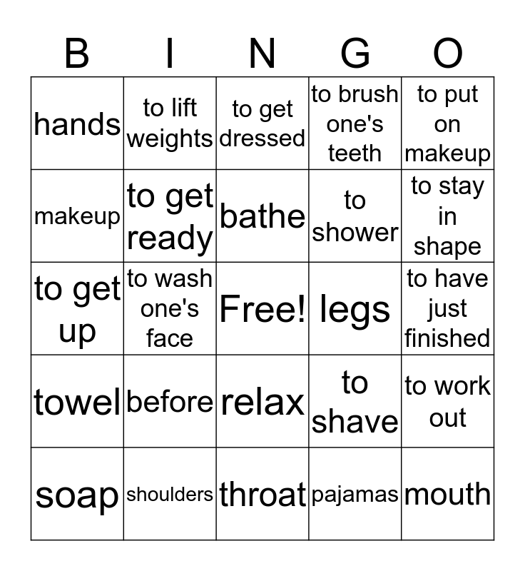 This bingo card has a free space and 24 words: before, shoulders, bathe, soap, to put on makeup, hands, makeup, to lift weights, legs, relax, to shower, to get up, to shave, to work out, to get ready, pajamas, to have just finished, to get dressed, to stay in shape, to wash one's face, mouth, towel, to brush one's teeth and throat.