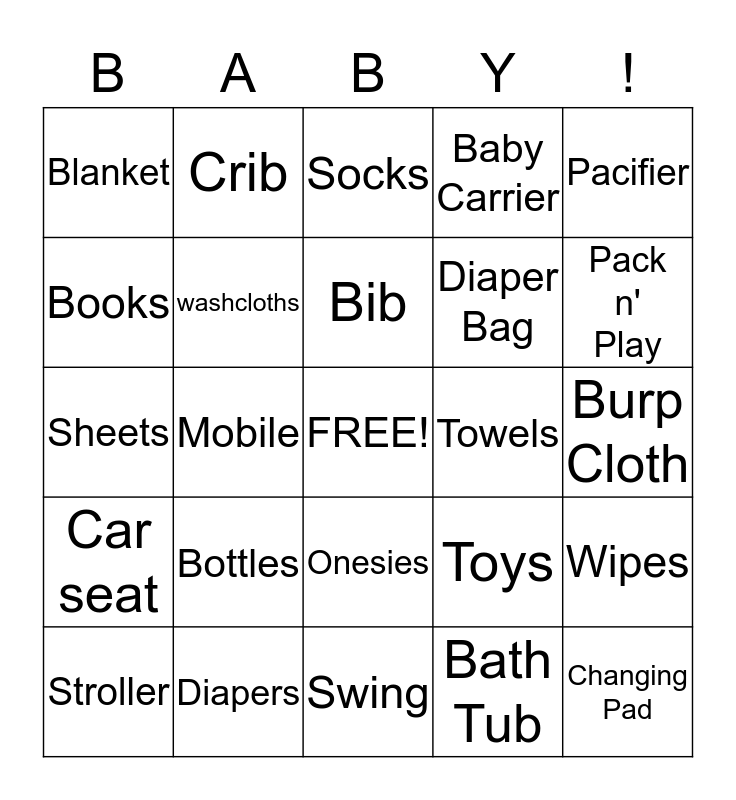 This bingo card has a free space and 24 words: Bottles, Diapers, Bib, Stroller, Pacifier, Blanket, Books, Crib, Towels, Onesies, Diaper Bag, Sheets, Toys, Wipes, washcloths, Bath Tub, Burp Cloth, Socks, Pack n' Play, Mobile, Changing Pad, Car seat, Baby Carrier and Swing.