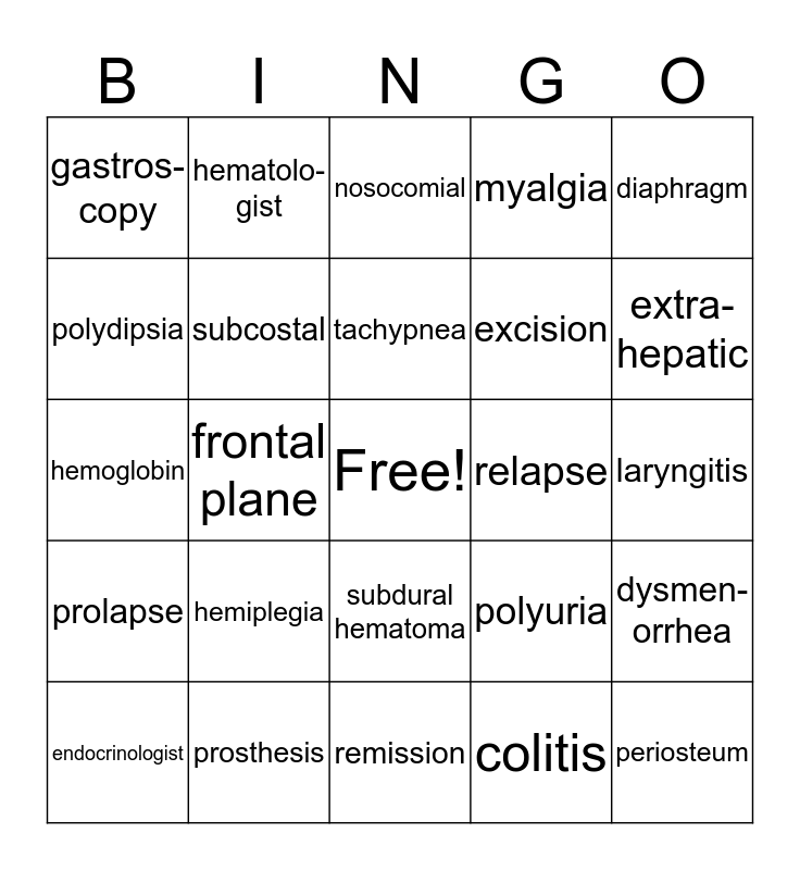 This bingo card has a free space and 39 words: media-stinum, trachea, uremia, subcostal, endocrinologist, subdural hematoma, tachypnea, postmortem, diaphragm, prolapse, frontal plane, myalgia, periosteum, laryngitis, relapse, hemiplegia, gastro-enterologist, gastros-copy, nephro-logist, polyuria, polydipsia, remission, excision, extra-hepatic, antibody, dyspnea, cystitis, bradycardia, antigen, hematolo-gist, CABG, rhinotomy, nosocomial, prosthesis, colitis, thoraco-tomy, dysmen-orrhea, hemoglobin and aneurysm.