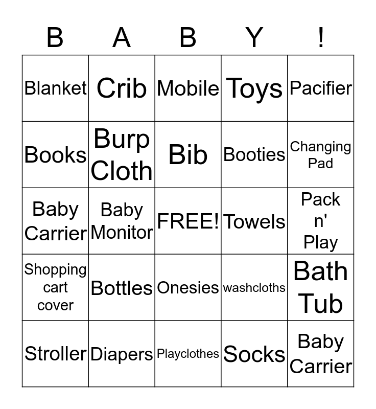 This bingo card has a free space and 24 words: Bottles, Diapers, Bib, Stroller, Pacifier, Blanket, Books, Crib, Towels, Onesies, Booties, Baby Carrier, washcloths, Bath Tub, Burp Cloth, Socks, Pack n' Play, Mobile, Changing Pad, Baby Monitor, Baby Carrier, Shopping cart cover, Toys and Playclothes.