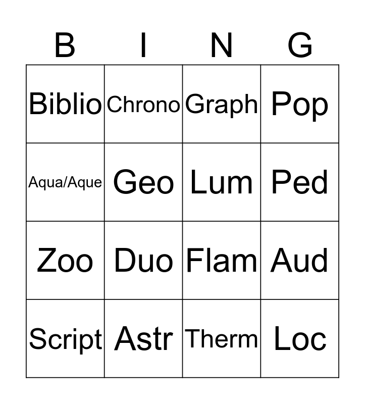 This bingo card has 20 words: Aud, Chrom, Graph, Scend, Script, Aqua/Aque, Astr, Biblio, Zoo, Chrono, Duo, Flam, Geo, Loc, Lum, Mar, Ped, Pop, Therm and Vid/Vis.